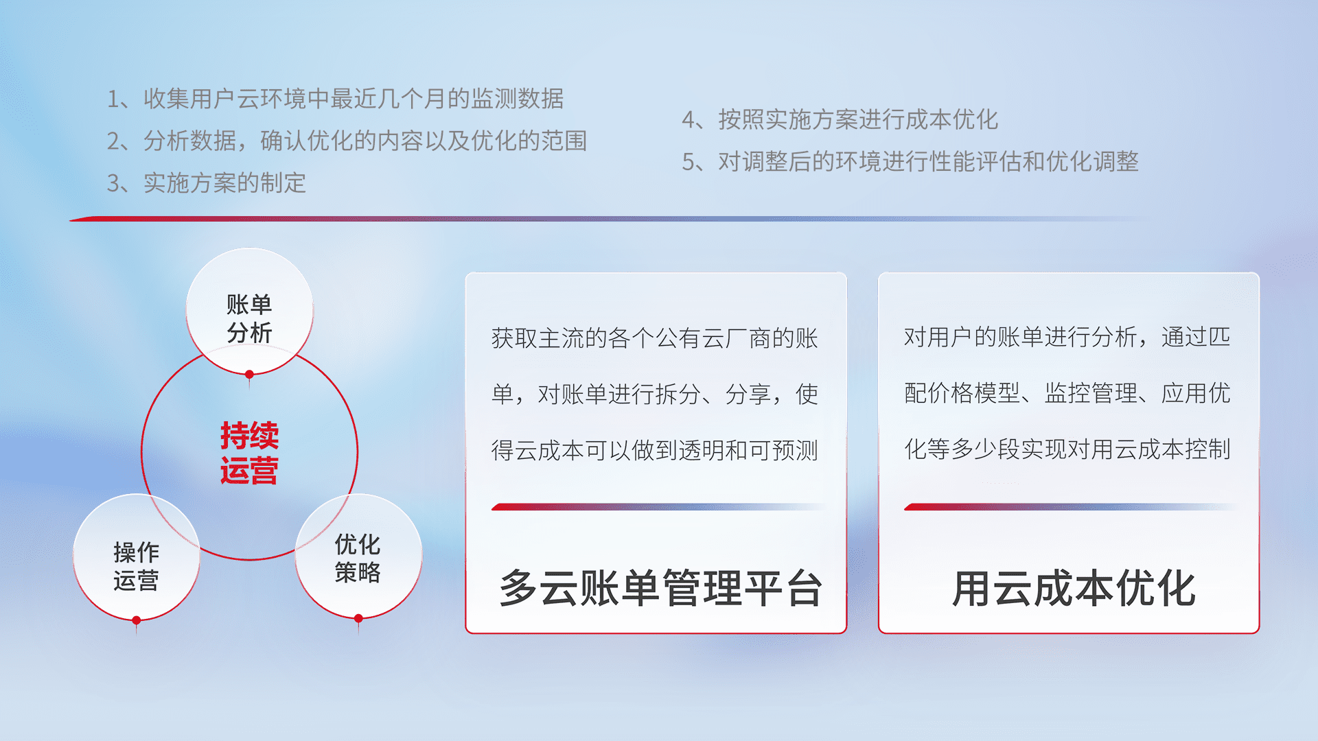 通过多云纳管,,,,以统一的资源数据模型把客户的云资源进行抽象和封装,,,,进而实现对多云资源的统一操作,,,保障云资源管理的可靠性、、、稳定性与可用性。。。量身定制化运维内容,,,配置、、开发运维、、补丁管理、、、备份、、监控、、、、认证和访问管理、、审计和日常巡检等,,,,保障在用云过程中的可靠度,,,,稳定度以及高可用率。。